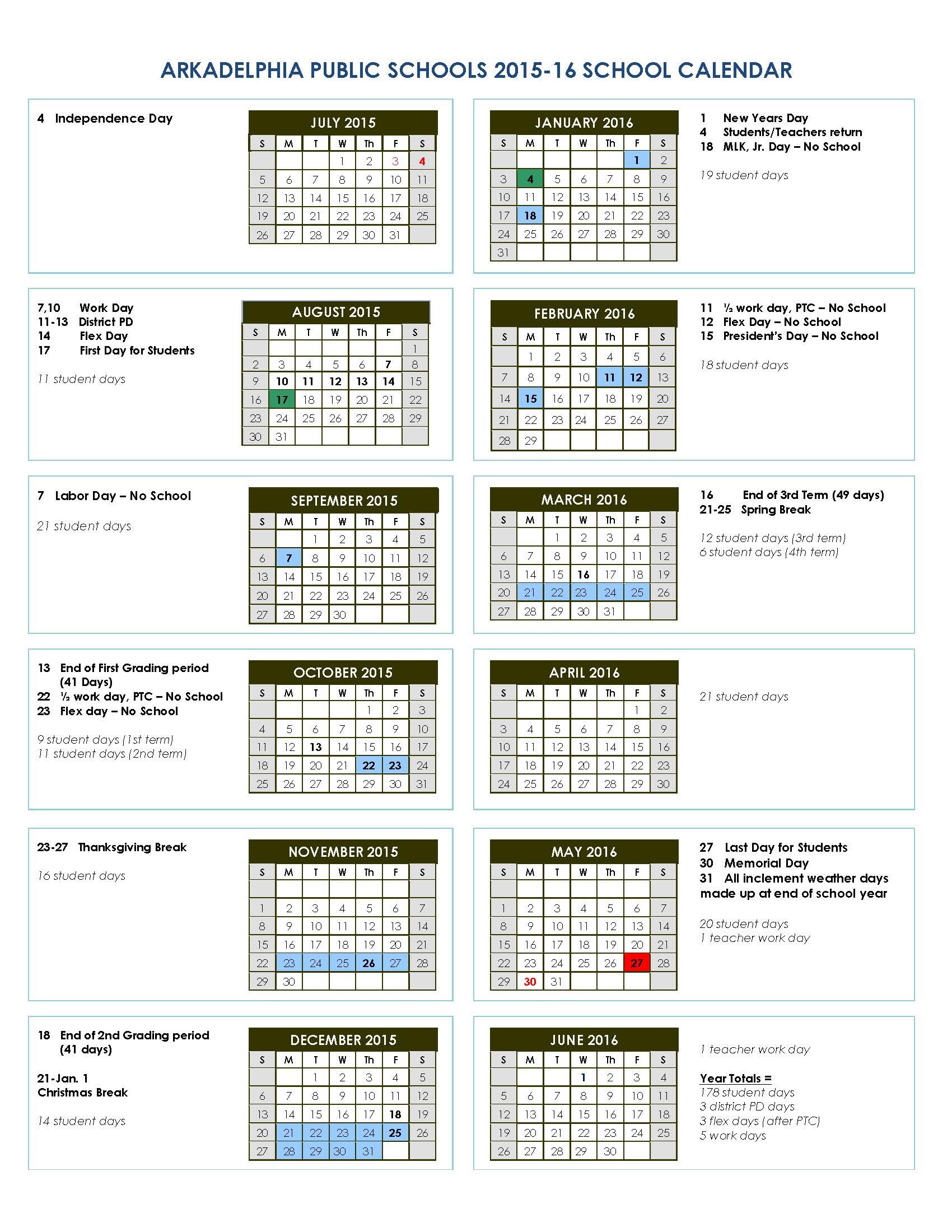 The APS Board of Education approved the 2015-16 district calendar during the April board meeting. Monday, Aug. 17 will be the first day of the 2015-16 school year, which will conclude on Friday, May 27, 2016. Other highlights of the calendar are one week off for Thanksgiving Break from Nov. 23-27, two weeks off for Christmas Break from Dec. 21-Jan. 1, one week off for Spring Break from March 21-25, and holidays off including Labor Day, Martin Luther King, Jr. Day, and President’s Day. Any days missed for inclement weather will be made up beginning May 31.