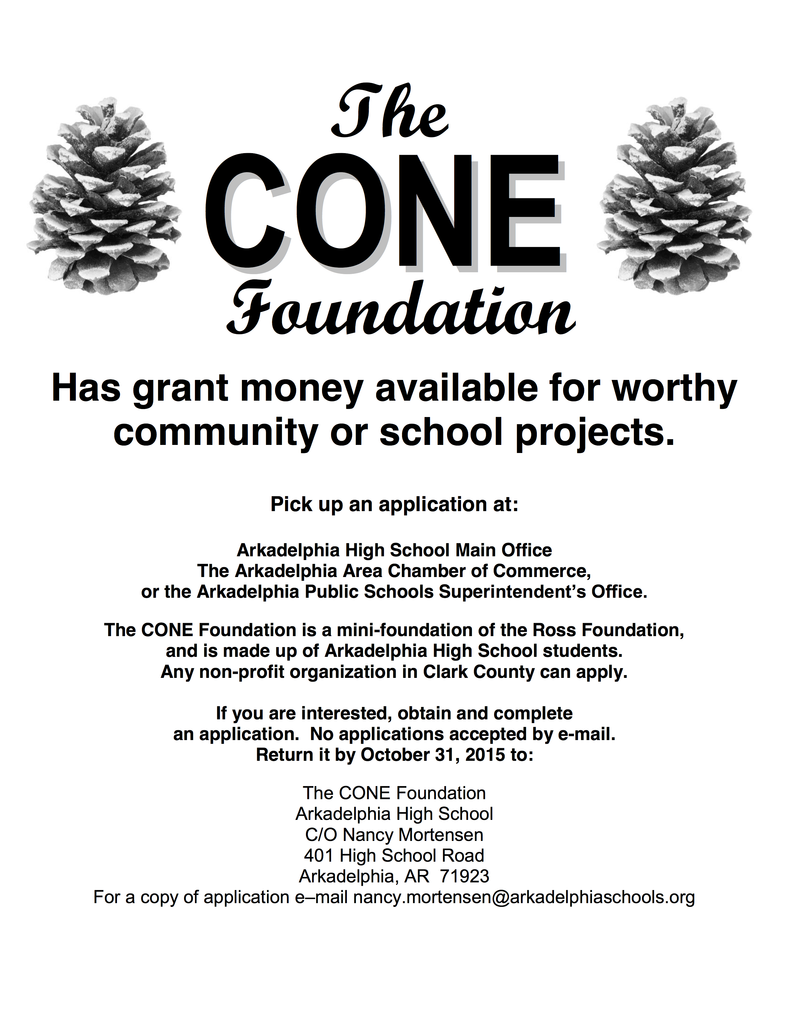 The CONE Foundation, operated by the senior Gifted and Talented class at Arkadelphia High School, has applications available for grants to any interested non-profit organizations in Clark County. You may pick up a copy of the application in your school office. Grant applications are also available at the Arkadelphia Chamber of Commerce and the Arkadelphia Public Schools Superintendent’s Office. Deadline for submitting the application is October 31, 2015. Please send (No email applications) applications to: The CONE Foundation c/o Nancy Mortensen at Arkadelphia High School, 401 High School Road, Arkadelphia, Arkansas, 71923. Thanks for your past and future support of CONE and giving us the opportunity to learn and serve the community.
