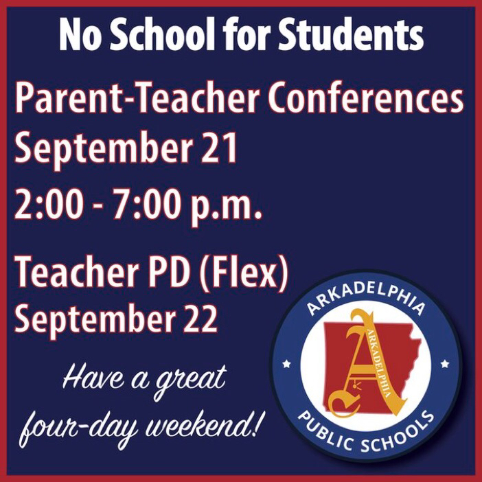Parent-Teacher Conferences are Thursday, Sept. 21. There will be no school for students Thursday or Friday. Have a great four-day weekend!