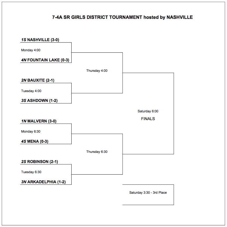 This is the first season that the District Tournament has taken on this format, due to the Arkansas Activities Association's implementation of the "blended conference" model for 2016-17. For more information on the blended conference model and how the 4A-7 District tournament format was set click here.