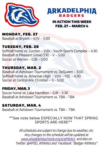 You'll see the week's schedule below and please note the disclaimer at the bottom about the schedule is subject to change. More than any other season, spring sports are affected by the weather quite often (see this week's forecast.) There WILL be changes to the schedules and we'll post on our "Badger Athletics" Facebook page and "@APSD_Athletics" Twitter account.