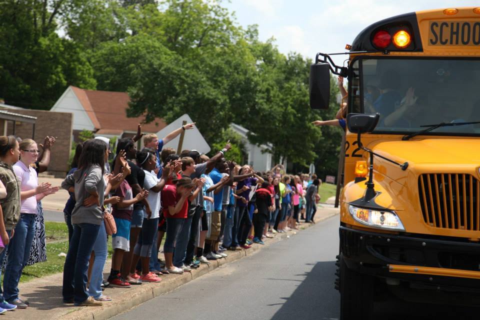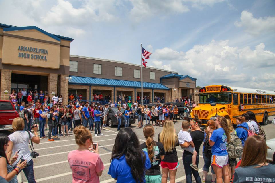 As a part of the bus tour, the students from each of the schools join their teachers at their respective campuses and cheer for the Badgers waving signs and wishing the Badgers luck before they leave for Fayettville.