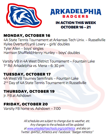 State Tennis and District Volleyball on tap for this week plus week 8 for football. Go Badgers!