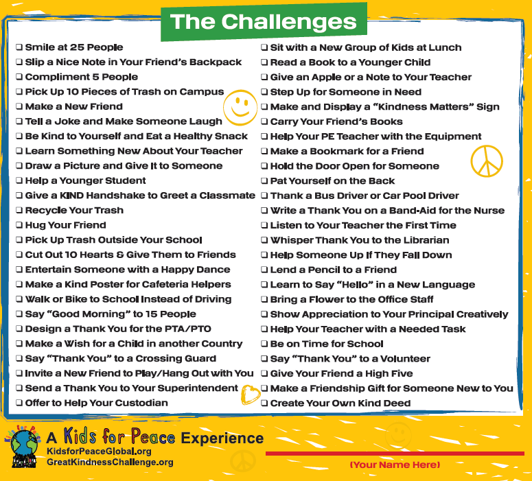 Imagine students complimenting each other, reaching out to a lonely child, picking up trash, surprising friends with happy notes in their backpacks, thanking their teachers creatively, and eating lunch with a new group of friends. These kind acts and more will happen in schools across all 50 states during the 4th Annual Great Kindness Challenge ! Schools complement and enhance the GKC week with kindness rallies, anti-bullying essay contests, kindness-themed spirit days, the GKC theme song (Kind-Hearted Hand), and Kindness Stations at recess to practice and reinforce the idea that Kindness Matters!
