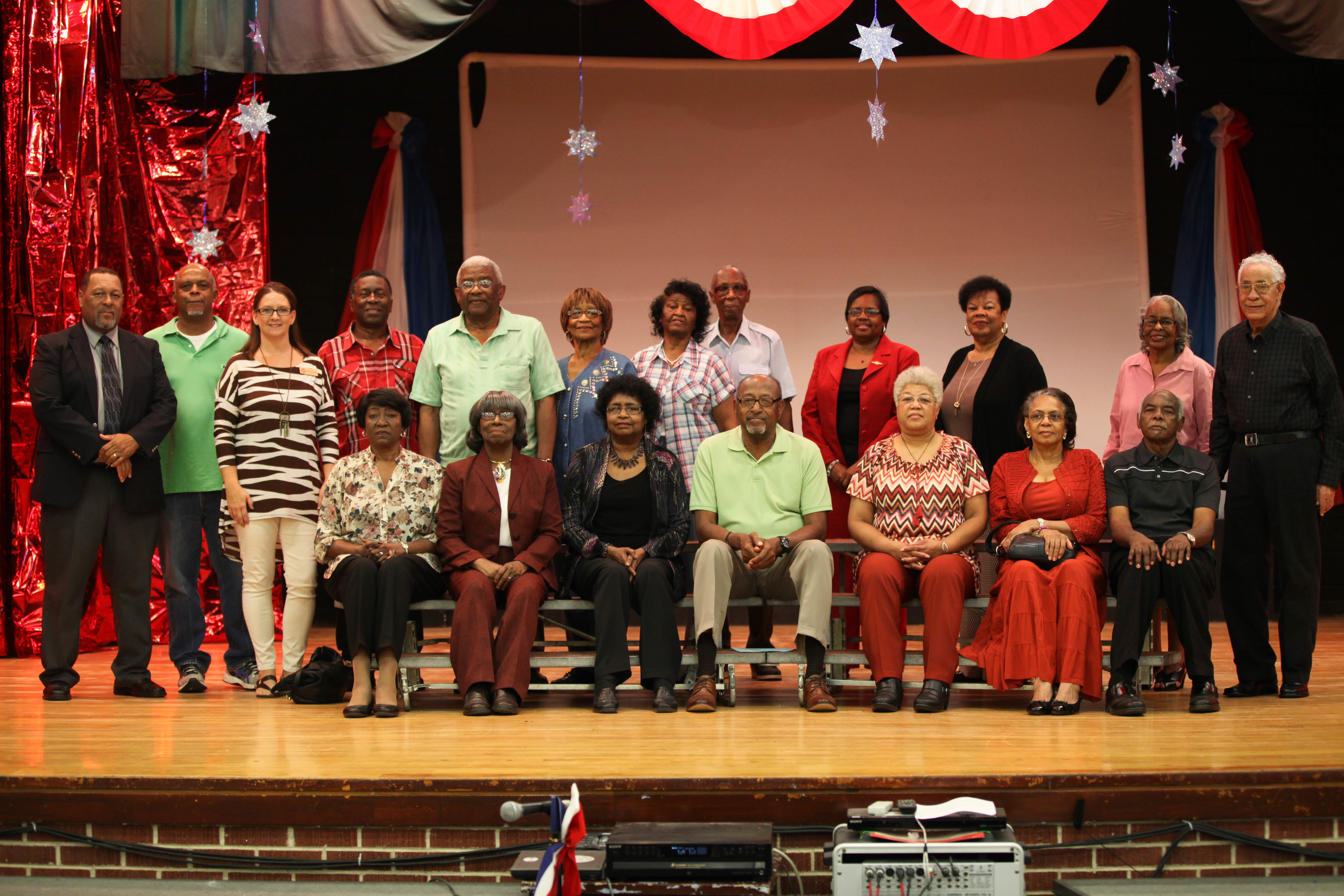Back (left to right): James Horton, Michael Blevins, Peake Principal Nikki Thomas, Gary Hunter, Willard Reed, Gracie Reed, Fannie Lee, Robert Lee, Patricia Wright, Gloria Fallin, Sharon Taylor, Carrol Forte