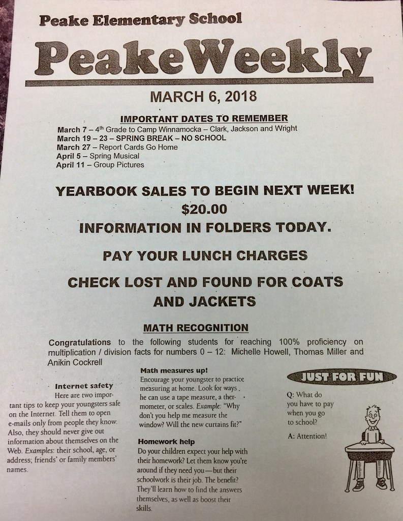 Peake's 5th grade Quiz Bowl team won 4th place in the Murfreesboro Quiz Bowl Tournament on Feb. 8. Peake was among 14 5th and 6th grade teams that participated in this event.