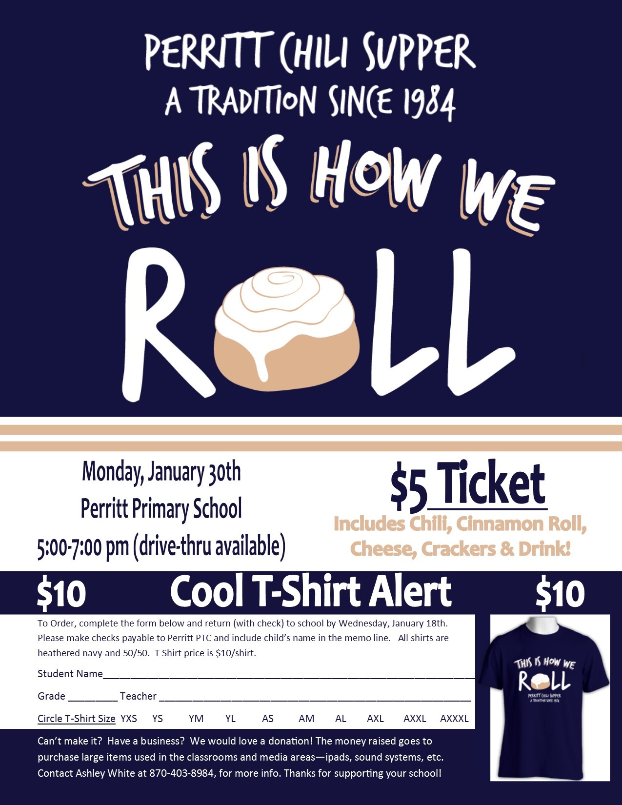 Perritt Primary will be hosting its annual Chili Supper on Monday, January 30. Tickets are $5 and include chili, cinnamon roll, cheese, crackers and a drink! T-Shirts are available for $10. The money raised goes to purchase large items used in the classroom and media areas - ipads, sound systems, etc. Contact Ashley White at 870-403-8984 for more information.